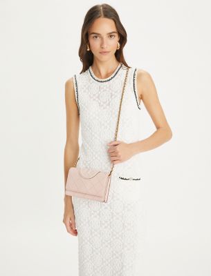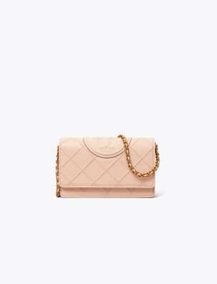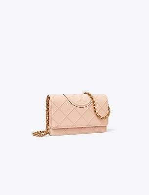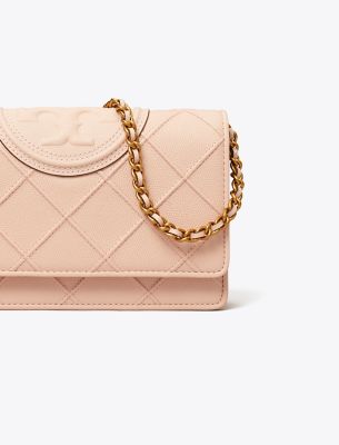 Enduring glamour. Diamond pintucks. Brushed chain, braided with leather. A feminine silhouette sealed with an oversized Double T. The Fleming Soft Chain Wallet is crafted in a super-fine grain calfskin for a smooth, luxurious feel, durability and high scratch-resistance — with pockets for cards, a phone and full-length bills.