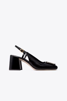 A square toe and square hardware in patent leather. The new Georgia Bombé Slingback has a dual-tone logo and elegantly sculpted block heel. Designed with a flattering high vamp and cushioned insole, it is sleek and versatile.