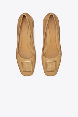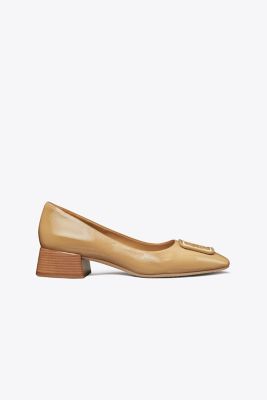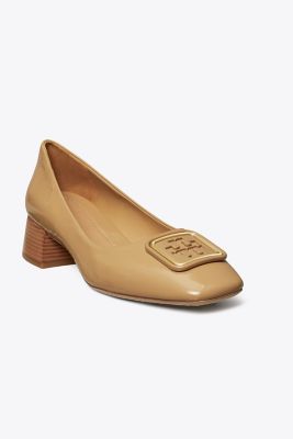 A square toe and square hardware in soft patent leather. The Georgia Pump mixes tonal textures, designed with a Sixties-era block heel and a cushioned insole. Balance the volume of a loosely tailored suit with its angular shape.