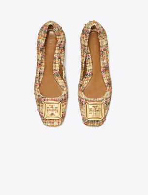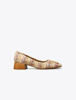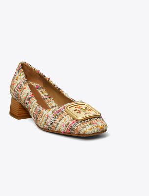 A square toe and square hardware in color jacquard tweed. Designed with a dual-tone logo, the Georgia Pump has a ’60s block heel and a cushioned insole. Balance the volume of a loosely tailored suit with its angular shape.