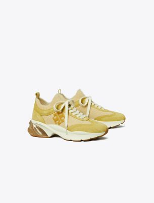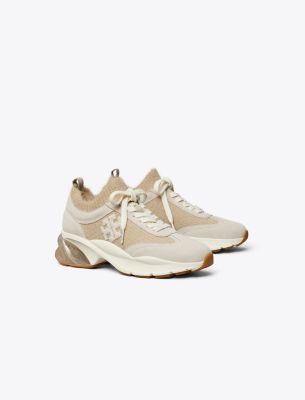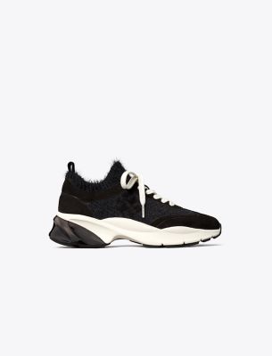 Our trainer is characterized by superior comfort, flattering lines and discreet symbols of luck — a longtime fascination of Tory’s. An oversized ergonomic sole adds lift, deep ankle scoops elongate the leg and a structural wishbone within the cushioned midsole acts as a cambrion, reinforcing the shoe’s internal support system. Updated with mohair knit and suede for seasonal warmth.